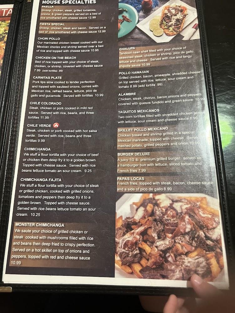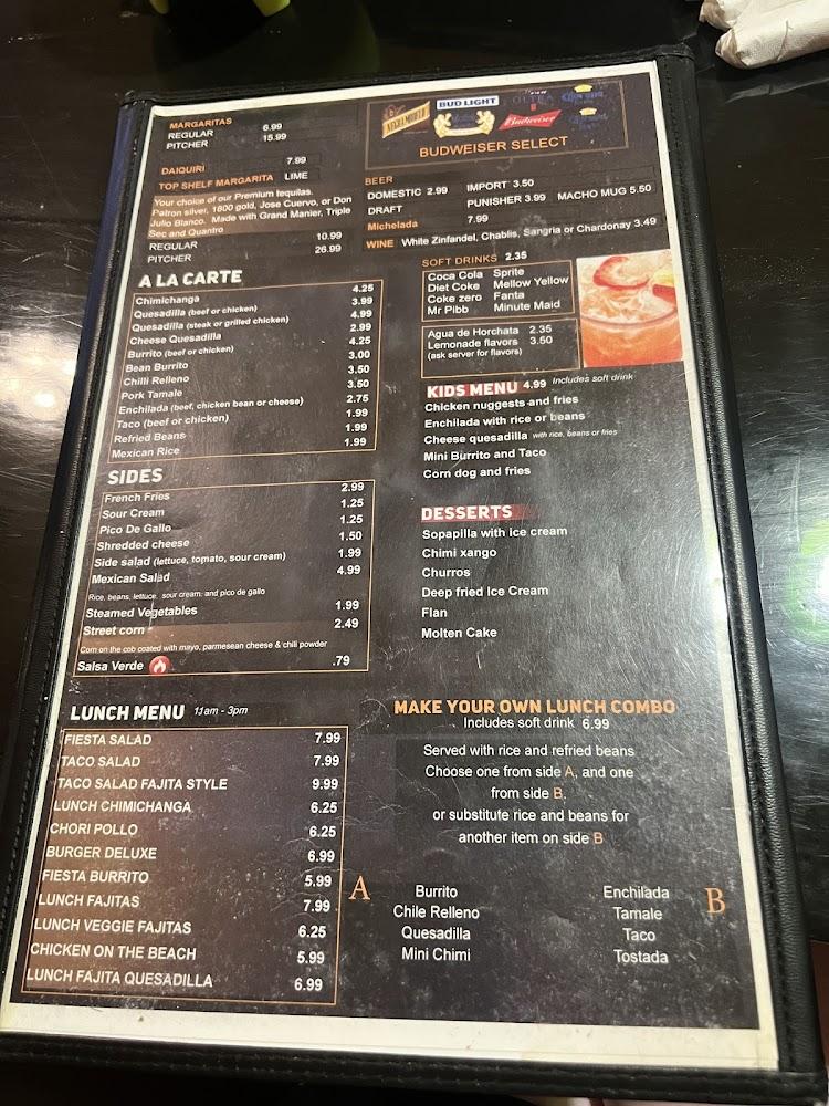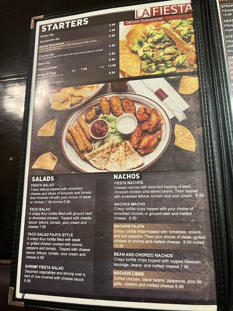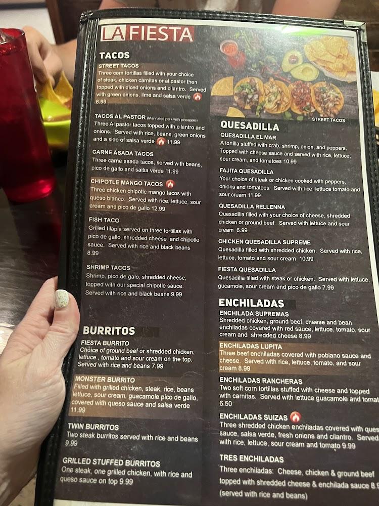 The menu at La Fiesta Mexican Restaurant features an extensive variety of dishes. With over 100 items, it caters to all tastes and dietary preferences.